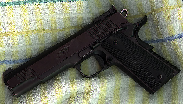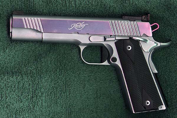 Penny's Kimber match .45, purchased from Champion Firearms. Out of the box it had an excellent trigger job and slide to frame fit. The only modifications that have been done are a McMillan/Jones flat trigger, a match bushing, and a hard chrome job by Cobra Chrome (Virgil Tripp). The photos show the Kimber before and after the hard chroming. During 1998 Penny used this gun to win her class at the Make a Wish charity match, Space City Challenge, and the Coors/Taurus Paper and Iron Championship.