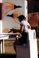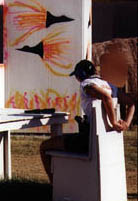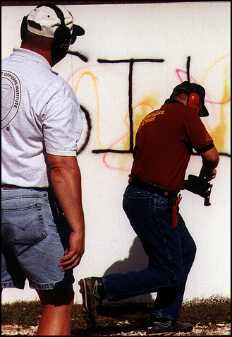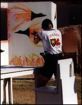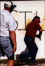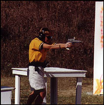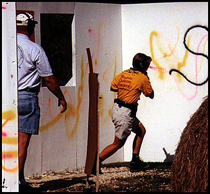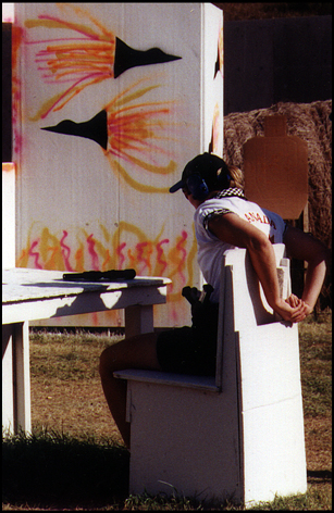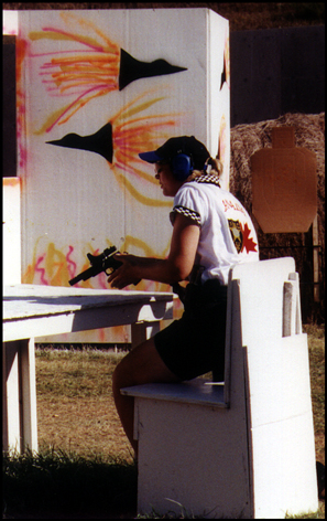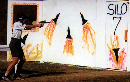 Jerry Miculek performs one of many reloads, and Sheila Brey engages the first