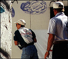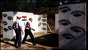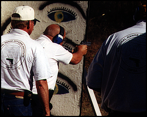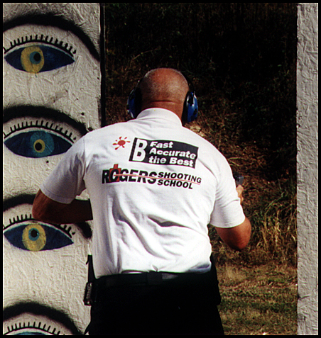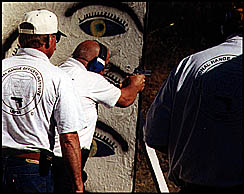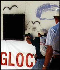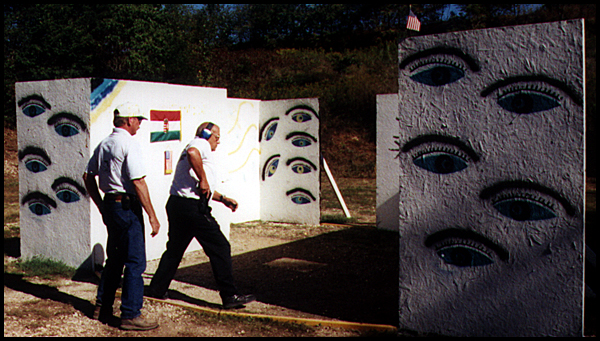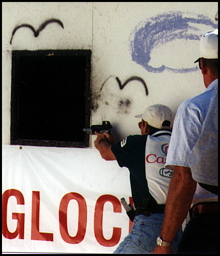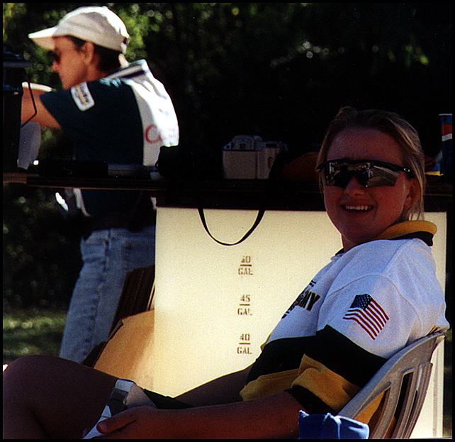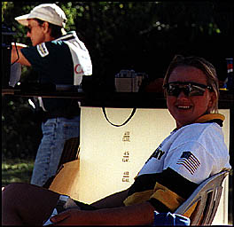 relaxes after finishing the match, while Match Champion Kay Clark Miculek prepares