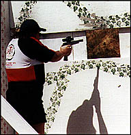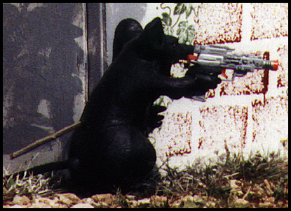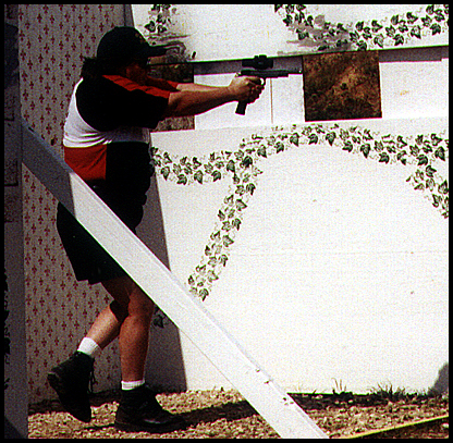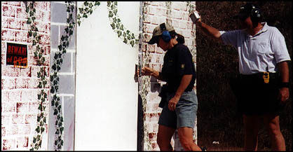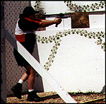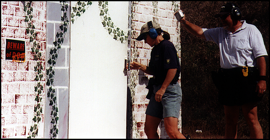 Sheila Brey prepares to take on the rats, and starts to open the door at the buzzer. Barbara Sumrall engages targets at the rear and blasts through the last port.
